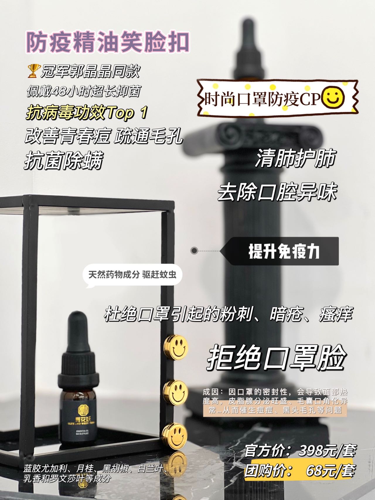 ?寶藏級單品 防疫最佳cp芳香植物(wù)萃取精油+笑(xiào)臉扣,天然肌膚屏障、痘痘肌、敏感肌的(de)春天!抗菌抑螨、抗炎症、防蚊蟲、清肺護肺、提升免疫力®,天然尤加利植物(wù)成分(fēn),植物(wù)沁香、遠(yuǎn)離(lí)病毒,拒絕異味!感受被自(zì)然擁抱般的(de)舒适。